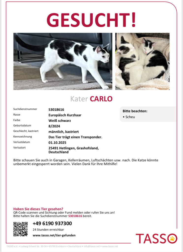 Sie ist entflohen, was wir selber nicht mitbekommen haben. Sie kann vom Fenster aus zum Dach entflohen sein, was bedeutet, dass sie verletzt sein kann, und sie ist eine sehr ängstliche Katze.