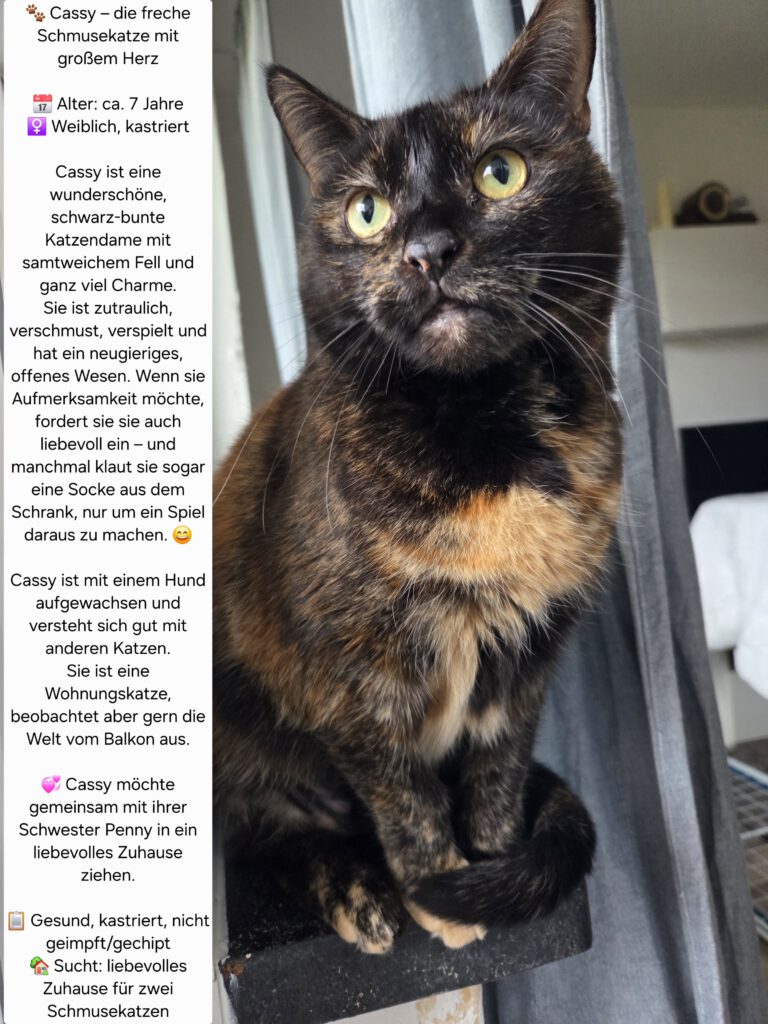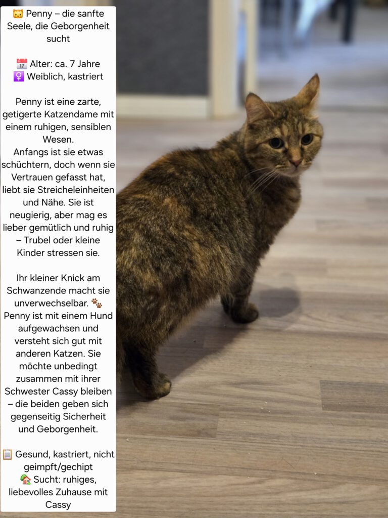 Wir suchen ein liebevolles neues Zuhause für die beiden, da ich aus beruflichen Gründen aus dem Treppenviertel umziehen musste. Es wäre ideal, wenn die beiden in ihrem vertrauten Revier bleiben könnten, anstatt in eine kleine Wohnung in Berlin umzuziehen.